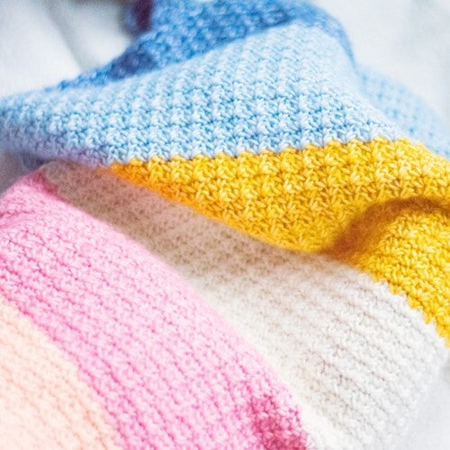 dit babydeken is gehaakt met yarn and colors dat is een mengsel van katoen en arcly. hij is geschikt voor jongen en voor meisjes. het is niet mogelijk om hem in een andere kleur te haken.